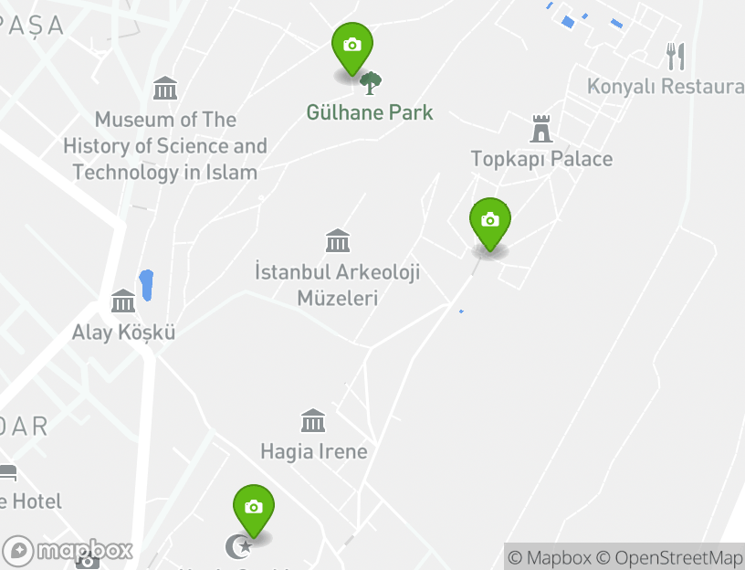 The itinerary includes stops at popular attractions such as Hippodrome (Sultanahmet Meydani), Gülhane Park (Gülhane Parki), Topkapi Palace (Topkapi Sarayi), and Hagia Sophia (Ayasofya).