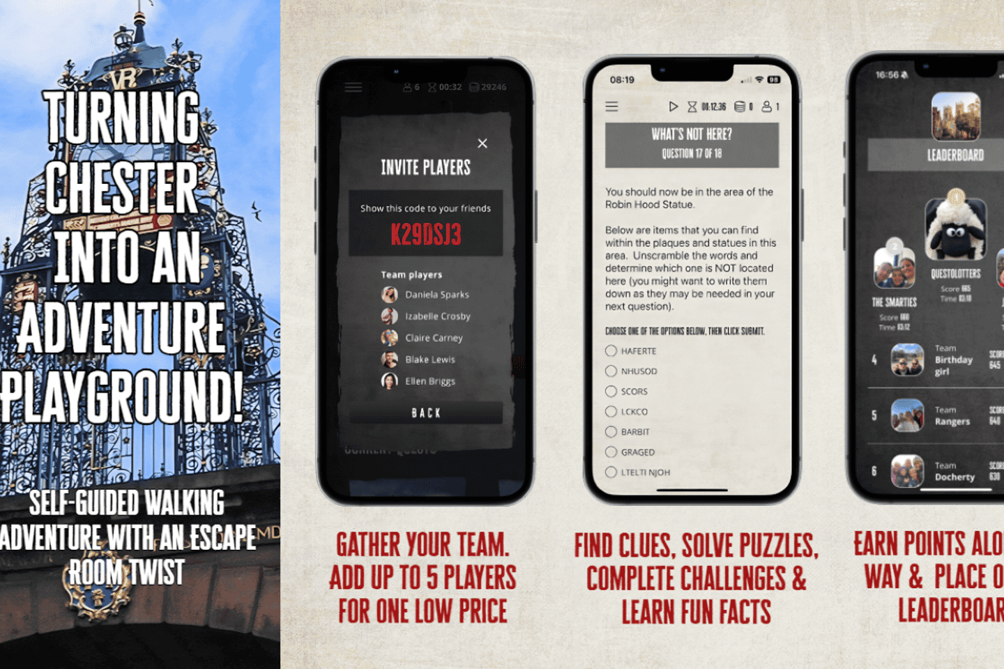 Discover Chester in England like never before with this self-guided walking adventure and exploration game. Armed with the Go Quest Adventures app, your team will follow a secret trail, solving puzzles and completing fun challenges as you unlock the city's mysteries at your own pace.