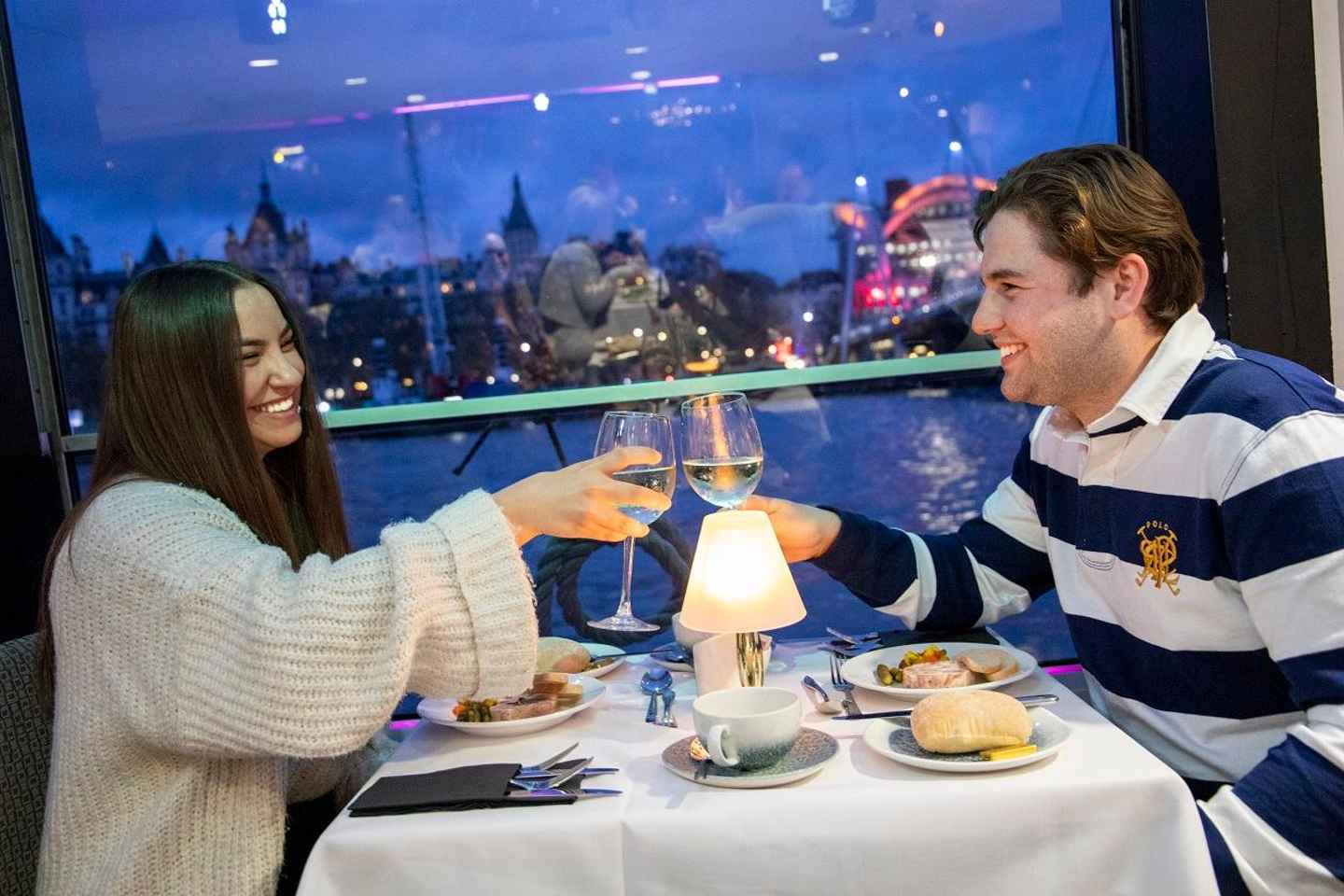 Experience a magical evening in London as you glide along the River Thames on a memorable dinner cruise. Begin your night with a warm welcome and a complimentary glass of sparkling wine, setting the perfect tone for an elegant evening on the water.