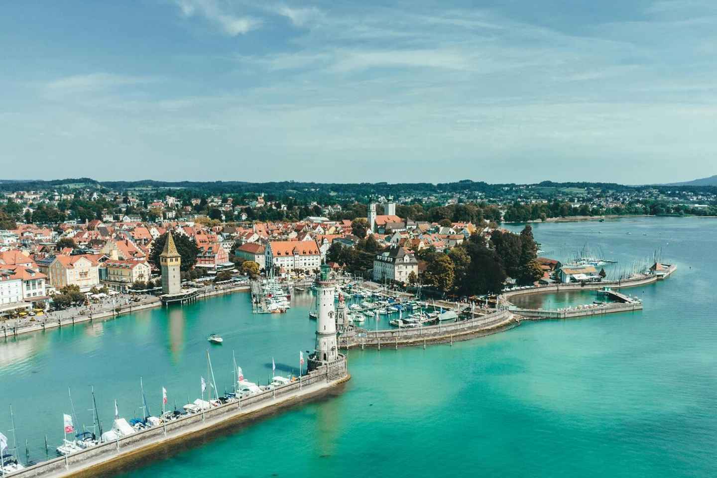 穿越德国,探索历史悠久的林道岛镇,其中世纪街道和港口入口处标志性的巴伐利亚狮子雕塑会让您心醉。登上灯塔,俯瞰博登湖和瑞士阿尔卑斯山的全景。