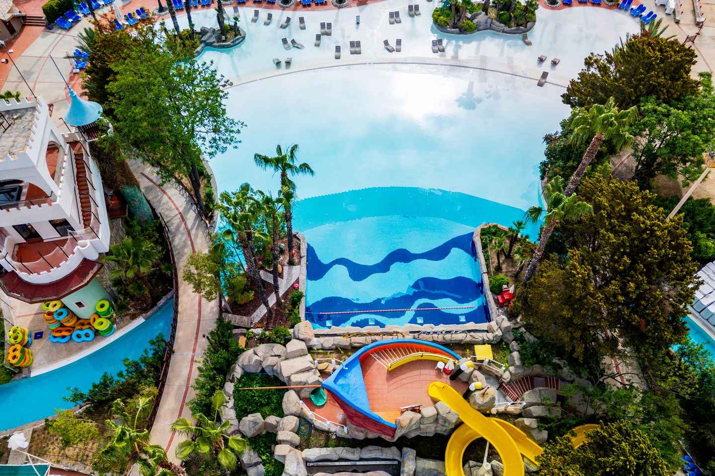 乐园内的迪士尼风格城堡增添了魅力,提供多种餐饮选择,还有成人专属的泳池酒吧。您可以在众多日光浴床上享受日光浴,沉浸在充满活力的氛围中。